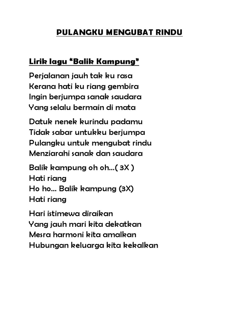 Balik kampung oh oh Balik kampung oh oh Balik kampung oh oh Hati girang Ho ho Balik kampung. Lirik Lagu Balik Kampung Sudirman. Perjalanan jauh tak ku rasa Kerna hati ku melonjak sama Ingin berjum.